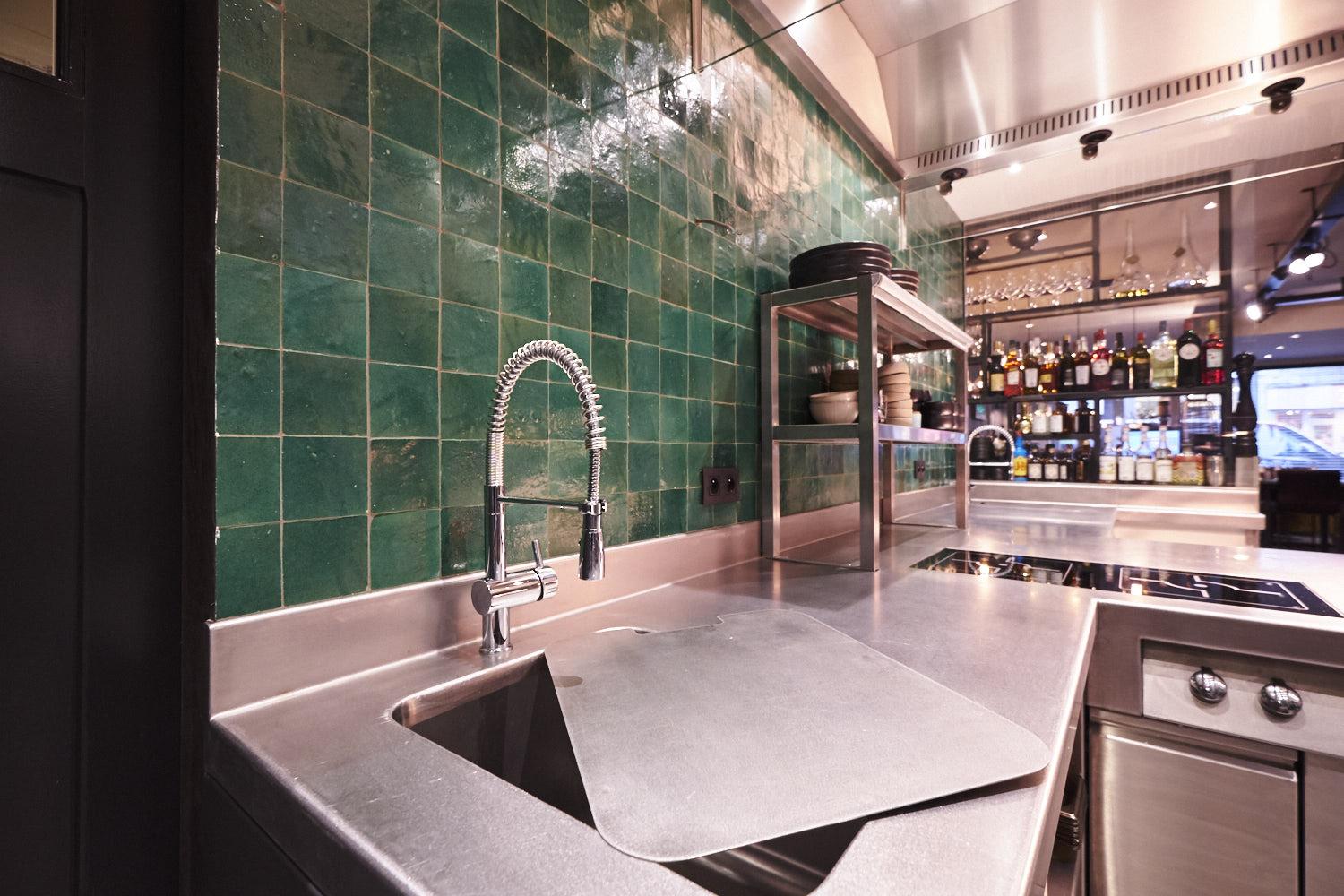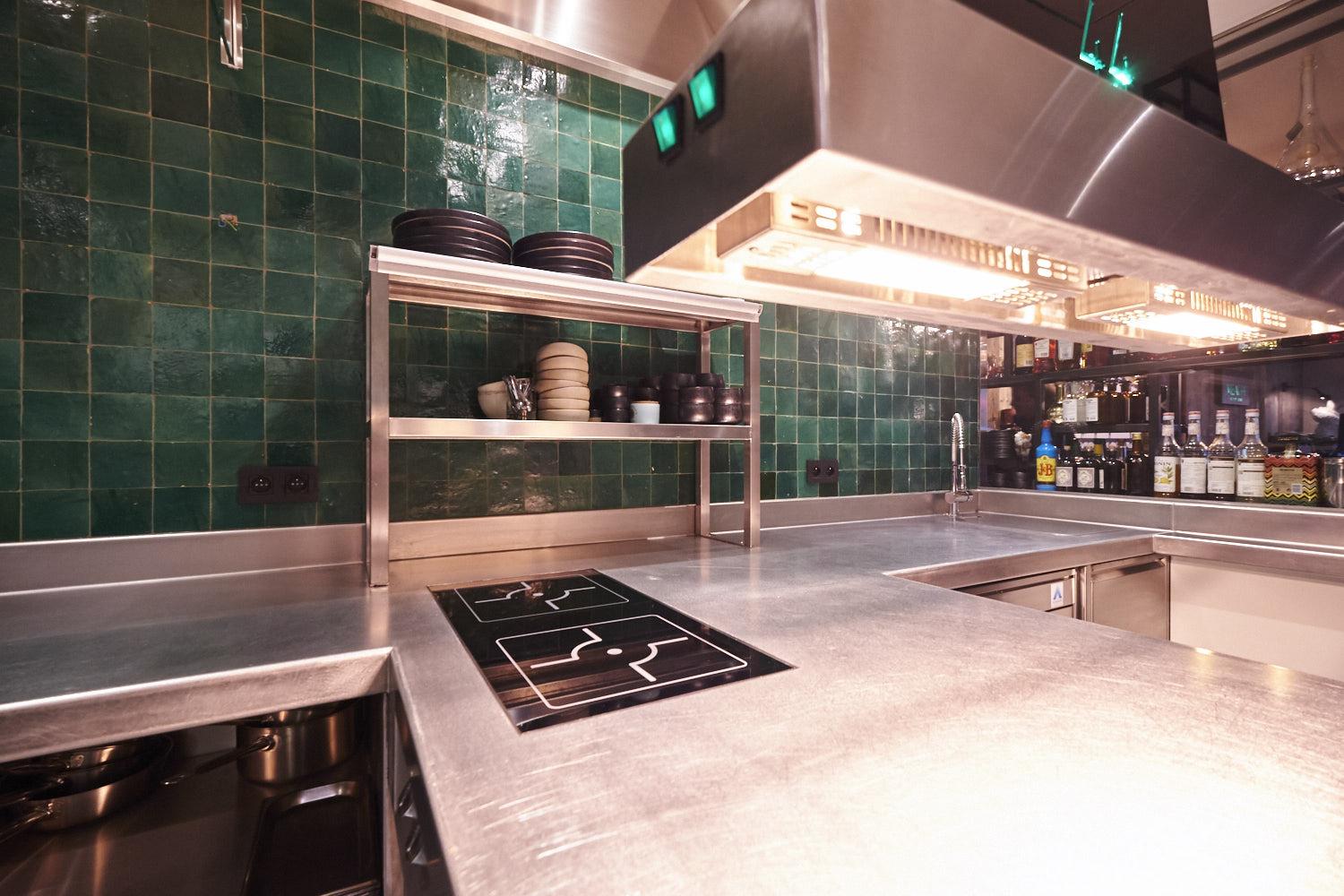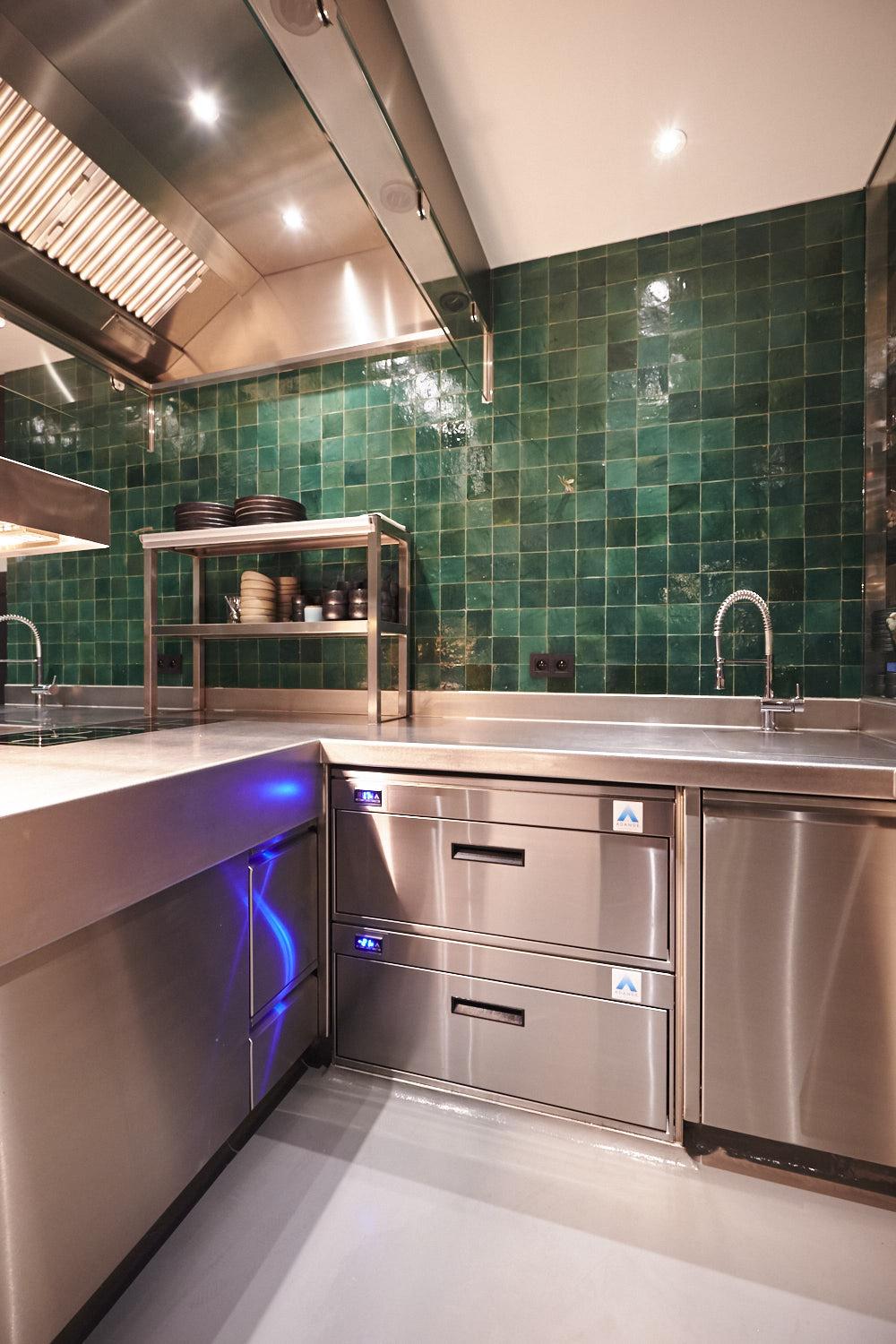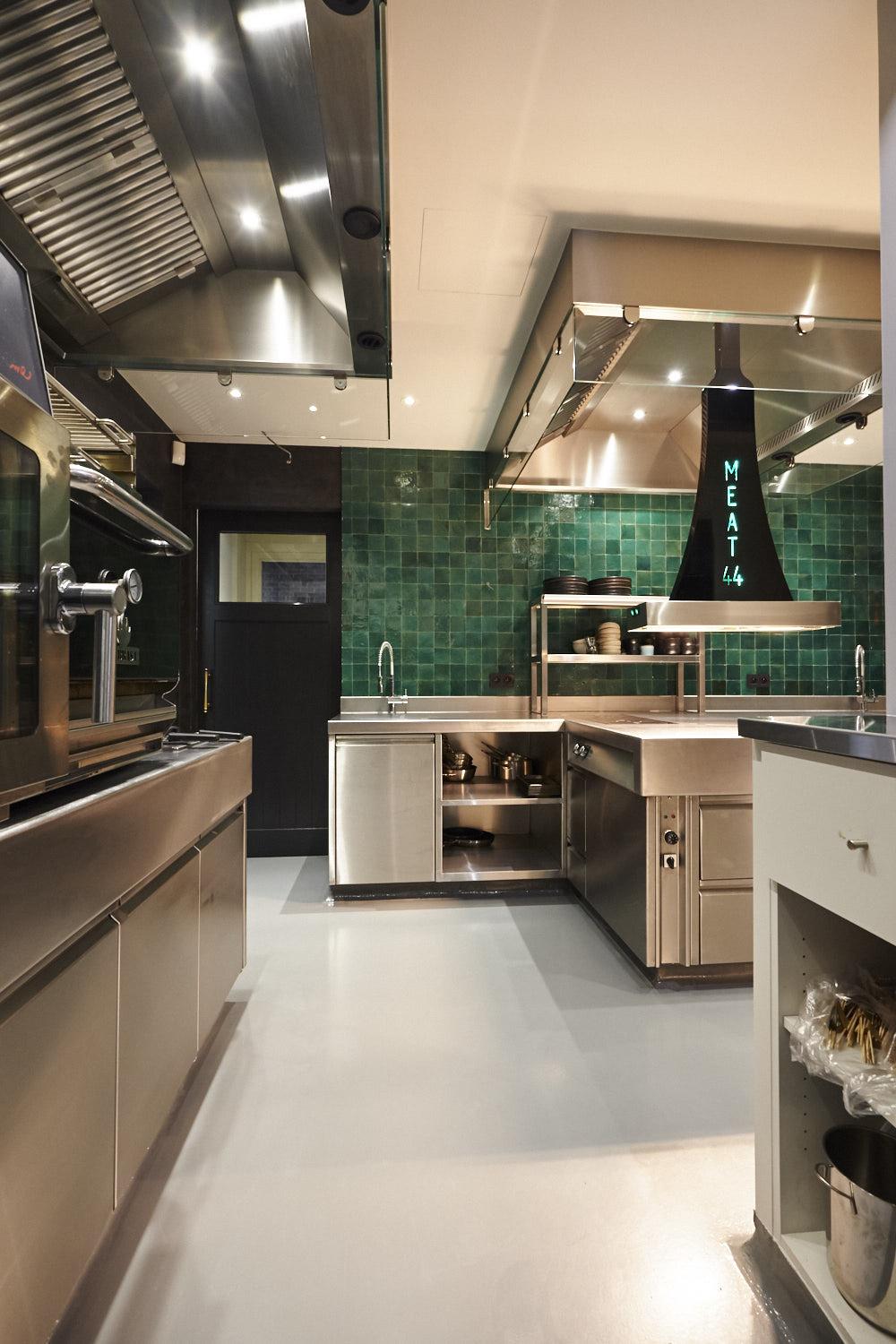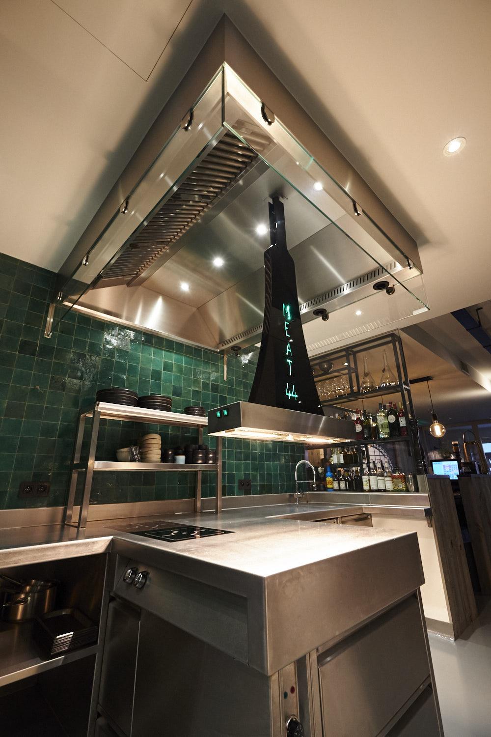 Cuisine ouverte pour Meat 44 avec une lampe chauffante au zénith