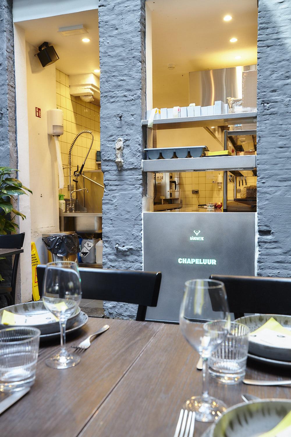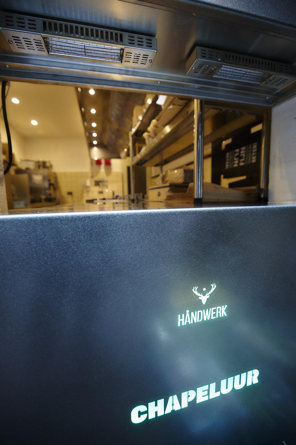 Het resultaat is een strakke maar gezellige maatwerkkeuken geworden, die volledig  afgestemd is op de noden van in-house, take-away en delivery bestellingen. Samen met een straf marketingplan werd Chapeluur  al snel een hotspot in Gent. Terug een klant voor Håndwerk om trots op te zijn.