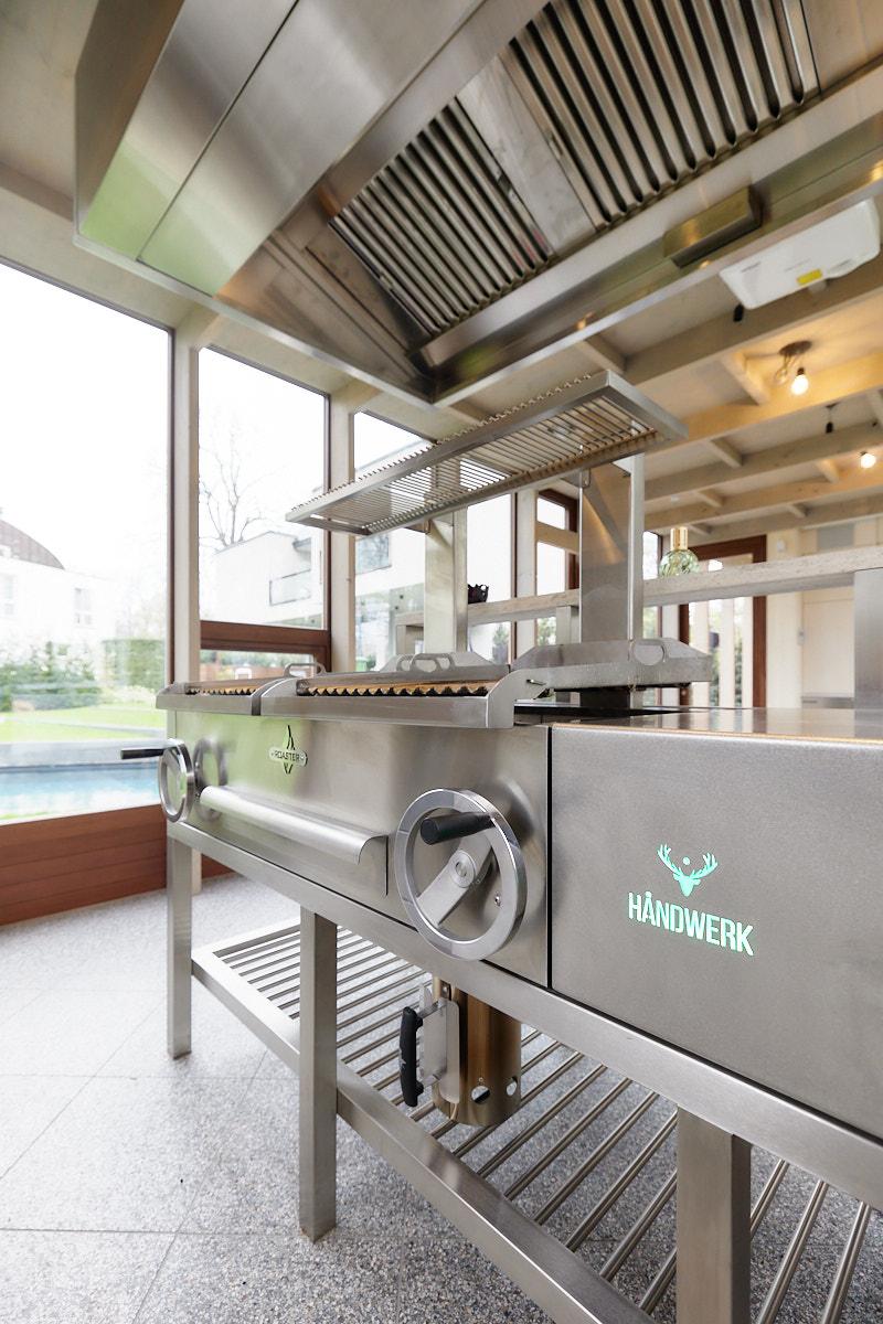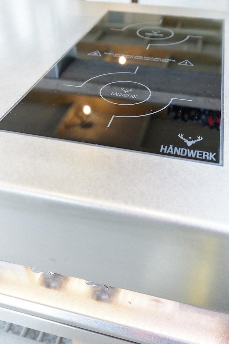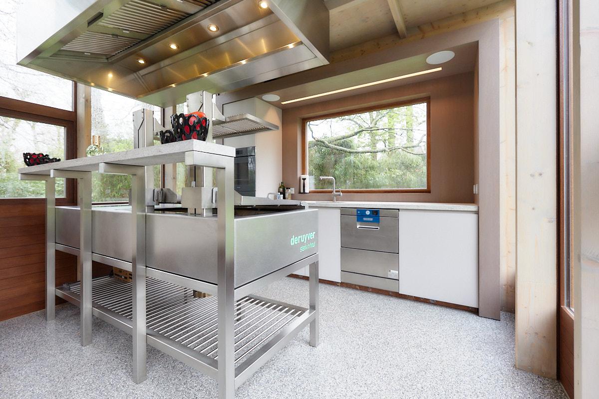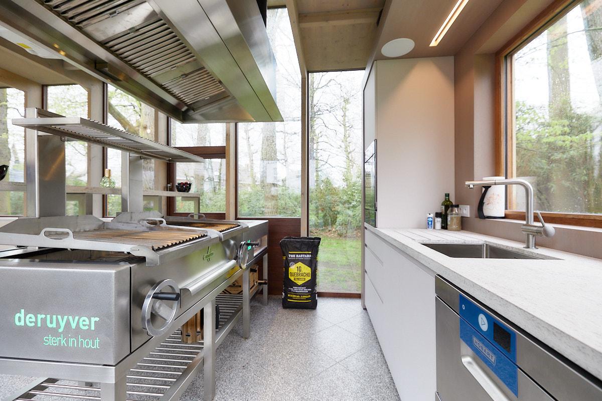 In opdracht van familiebedrijf De Ruyver NV, gespecialiseerd in houtconstructies & houten ramen/deuren werd een doordachte inrichting uitgewerkt voor een ontvangstruimte met beleving. Er werd een Håndwerk fornuis ontwikkelt met ingewerkte Parilla grill, afzonderlijk instelbaar, in combinatie met een 2 zonig inductiefornuis. Dit allemaal in een specifiek design op maat. Volledig geproduceerd in onze ateliers te Roeselare.