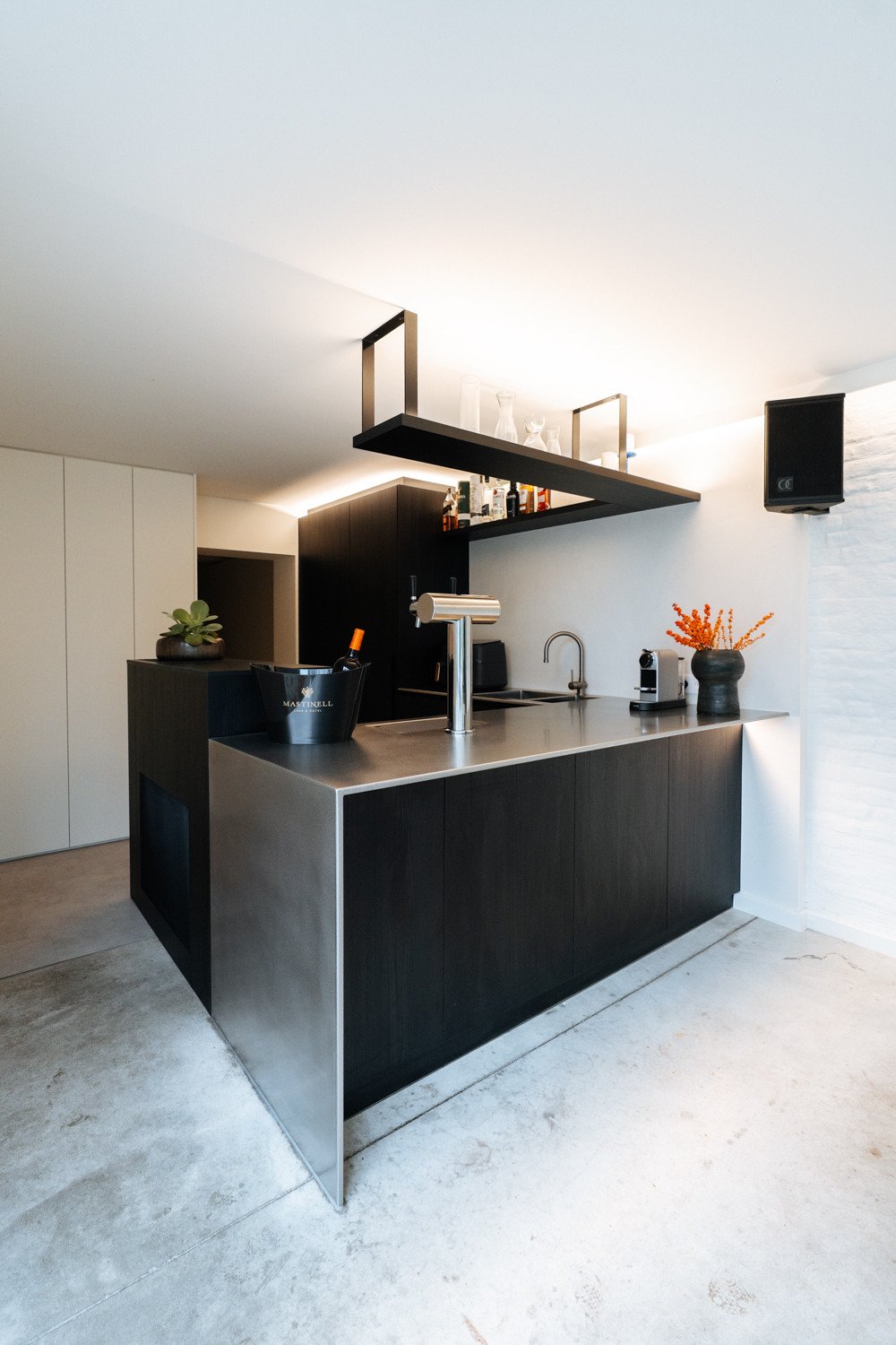 Mooie privé bar met naadloos ʜᴀ̊ɴᴅᴡᴇʀᴋ werkblad met dubbele tapzuil. Prachtig in combinatie met het schrijnwerk.