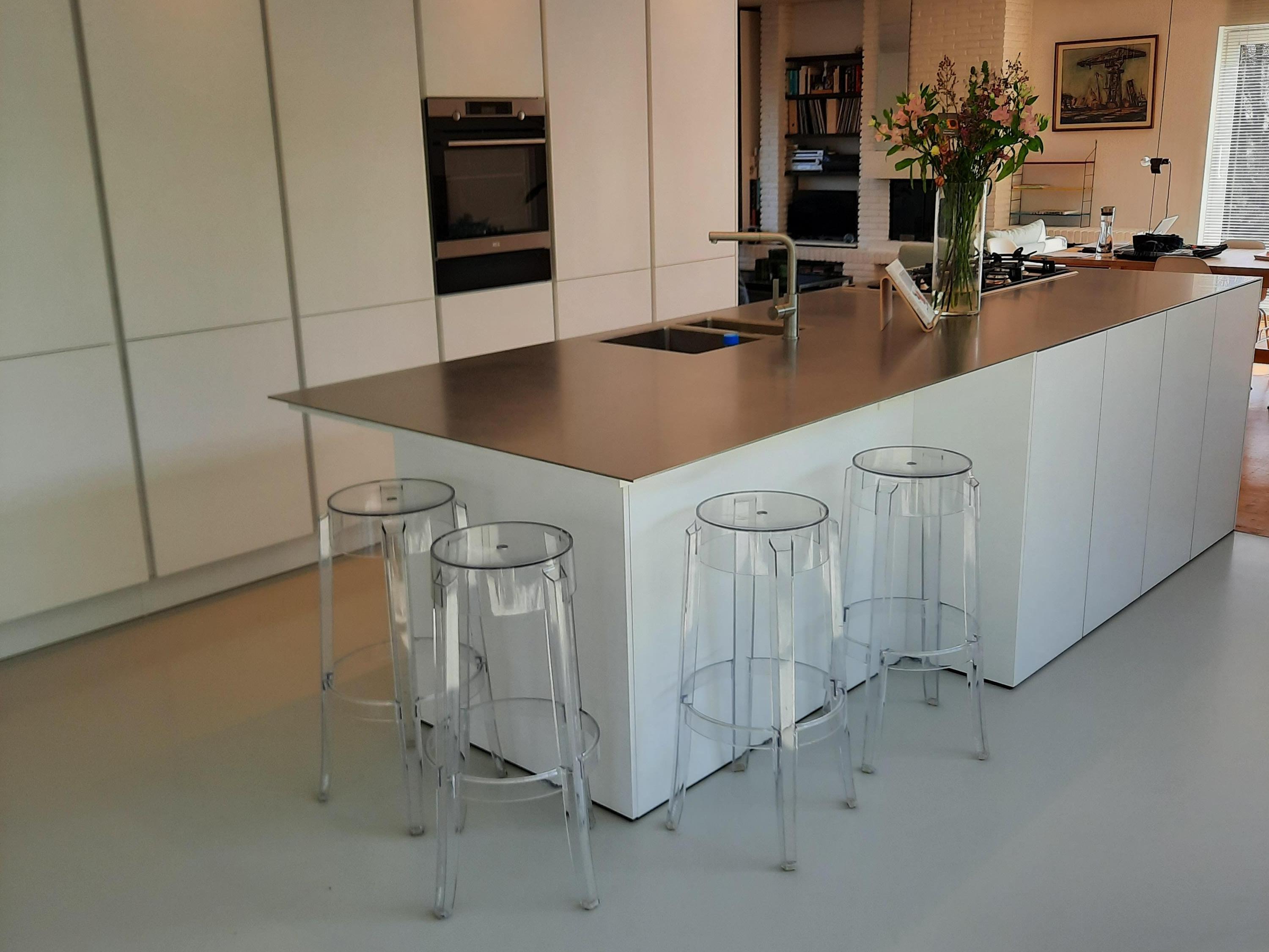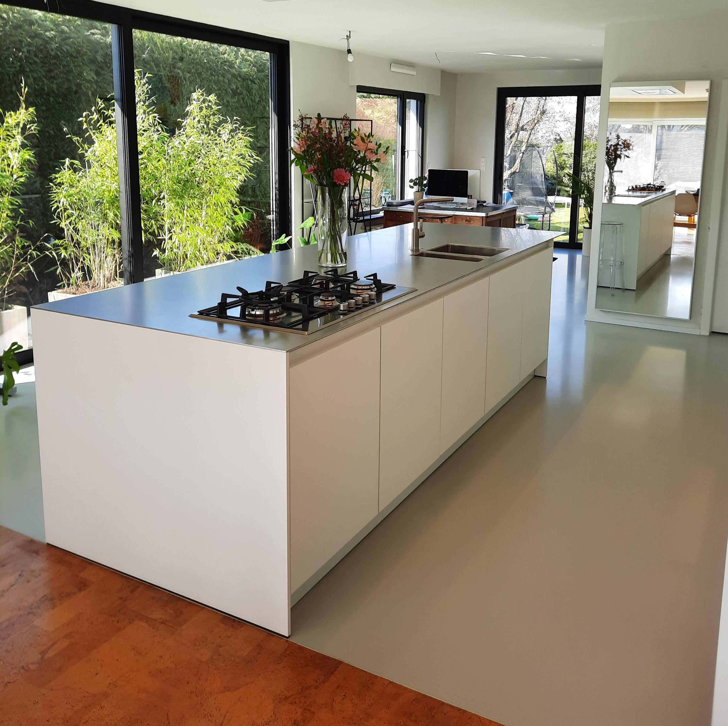 Keukenblad volledig in inox maatwerk. Blad werd orbitaal geslepen voor een prachtige afwerking.